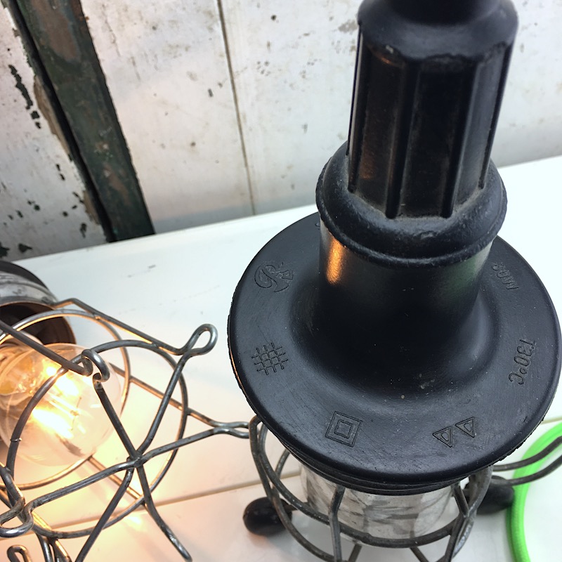 Since the early 40s, the company Ernst Rademacher has produced this patented hand lamp made of metal wire, rubber and glass. A classic that wasn’t missing in any workshop. Newly wired, sometimes if possible with the old plugs, it is a highlight and versatile. Whether as a table lamp, hanging on the wall or even without a plug and directly connected as a hanging lamp from the ceiling – always a piece of preserved industrial culture.